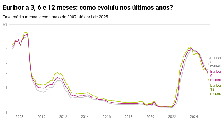 E a queda da Euribor não deverá ficar por aqui. De acordo com as expectativas do mercado, tudo indica que as taxas vão continuar a cair até ao final do ano, com a Euribor a 3 meses a fechar 2025 nos 1,84% e a Euribor a 6 meses a registar uma média de 1,93%. No início de 2026, as curvas ‘forward’ indicam ainda que estas taxas deverão manter-se nestes níveis antes de começarem a subir a partir de março do próximo ano.