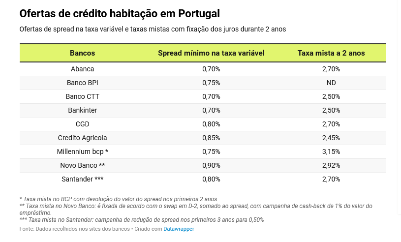 Enquanto a queda dos juros continuar, os bancos deverão seguir com a sua guerra de spreads, melhorando as suas ofertas de crédito habitação. No que diz respeito à taxa variável, há várias instituições bancárias a oferecer spreads a partir de 0,70%, como é o caso da Abanca, o Banco CTT e o Bankinter. Outros bancos, como o BPI e o BCP, oferecem spreads mínimos de 0,75%, de acordo com os dados recolhidos junto das páginas oficiais dos bancos. De notar que a estes spreads tem ainda de se somar a Euribor contratada (média mensal).